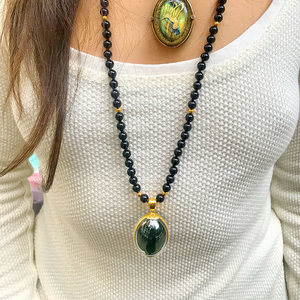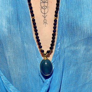 This one-of-a-kind mala is made with Obsidian beads with pure a Rainbow Obsidian yoni egg. The beads are (1.4mm) smooth with sterling silver plated accent beads. The mala rests just below the heart center. Tied with extra strength black string in traditional mala fashion with a knot between each bead. The yoni egg is held by a 100% Sterling Silver housing that is 100% sterling silver.