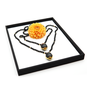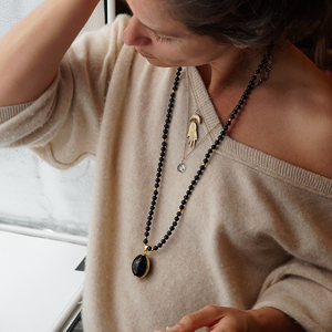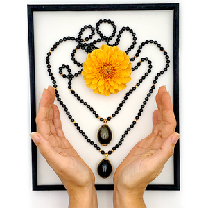 This one-of-a-kind mala is made with Obsidian beads with pure a Golden Sheen Obsidian yoni egg. The beads are (1.4mm) smooth with gold plated accent beads. The mala rests just below the heart center. Tied with extra strength black string in traditional mala fashion with a knot between each bead. The yoni egg is held by a 100% Sterling Silver housing that is gold plated.