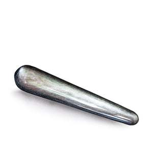 The Silver Sheen Obsidian Yoni Wand is used to enhance awareness of physical sensation and assist in the alignment of mind, body, and spirit during meditation and self-love rituals. The wand can be used for self-pleasuring and/or trauma-release by yourself or with a partner. Wand measures: Radius 1" length 6-7" crystals will vary slightly in size and length.